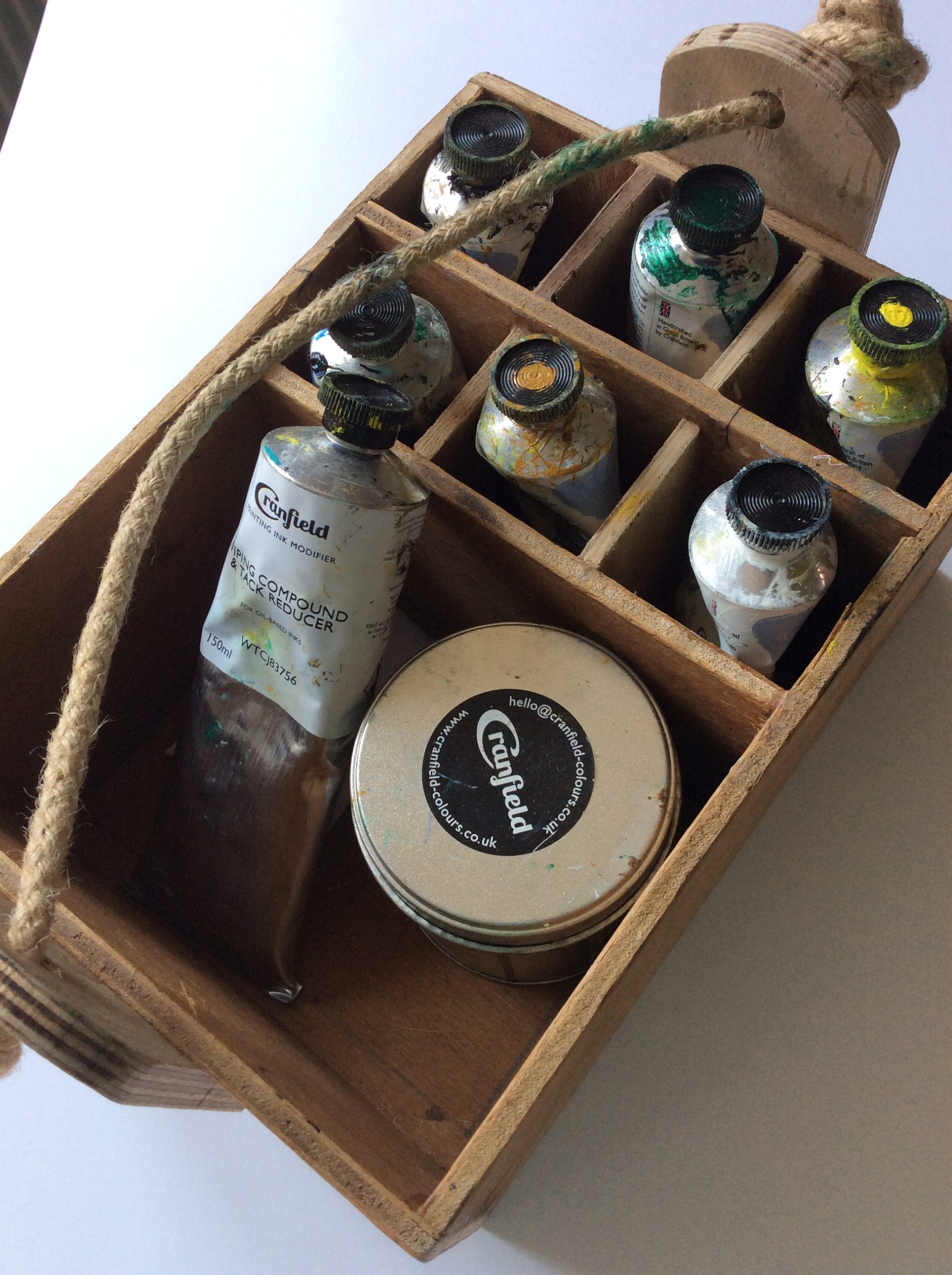 For many years I’ve used intaglio oil based etching ink for my Collagraphs. My trouble has always been cleaning my brushes. I go to the workshop, put my dirty brushes in my bag, think I will clean them when I get home, forget and end up with solid brushes I have to throw away. On visits to Printfest, I discovered that Cranfield make an oil based etching ink which is water soluble. Just what I needed! I thought I would give it a try and now I wouldn’t use anything else. The colours are wonderful and the ink is nice to use. My husband made me a cute box to carry my ink in, and my brushes are lasting so much better! Just wish they made a turquoise….